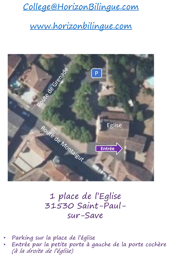 Nous avons le plaisir de vous inviter aux portes ouvertes du Collège Horizon Bilingue, collège franco-anglais situé à Saint-Paul sur Save. Elles auront lieu le samedi 14 mars de 10h à 12h, et seront l’occasion pour vous de rencontrer une partie de l’équipe enseignante, de découvrir notre projet éducatif, et d’échanger avec des parents d’élèves actuellement scolarisés. Au plaisir de vous y voir !